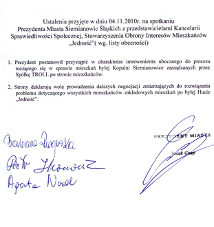 ![]() Przedmiotem rozmów były postulaty ruchu lokatorskiego dotyczące przystąpienia miasta do procesu wytoczonego przez lokatorów o unieważnienie bezpłatnego przekazania prywatnej spółce Troll 1000 mieszkań zakładowych dawnej kopalni Siemianowice oraz powstrzymanie licytowania budynków Huty "Jedność" wraz z lokatorami. Rozmowy zakończyły się sukcesem. Podpisano porozumienie, w którym prezydent Siemianowic zobowiązał się do wstąpienia w charakterze interwenienta ubocznego w proces z Trollem po stronie mieszkańców. Uzgodniono też, że jeszcze przed wyborami odbędzie się nadzwyczajna sesja rady miasta, która upoważni prezydenta do wzięcia udziału w najbliższej licytacji budynku zakładowego Huty "Jedność". Kolejna runda negocjacji w sprawie dalszego losu kilkuset lokatorów mieszkań zakładowych odbędzie się bezpośrednio po posiedzeniu rady miasta w ciągu najwyżej 7 dni. Wieczorem tego samego dnia odbyło się spotkanie przedstawicieli KSS i radnej Barbary Roguskiej z kilkuset lokatorami mieszkań zakładowych z Siemianowic, Mysłowic i Katowic. |