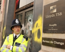![]() Przez pewien czas grupy anarchistów i działaczy radykalnej lewicy okupowały luksusowe sklepy przy londyńskiej Oxford Street. Część towarów została zniszczona lub wyrzucona na ulicę. Farbą i kamieniami były atakowane miejsca kojarzone z nadmiernymi zarobkami kapitalistów, takie jak salon samochodowy Porsche. Zniszczone zostały również witryny głównych banków. Interweniującą policję demonstranci obrzucili farbą. Doszło do starć. Podczas samej demonstracji oraz późniejszych walk zatrzymanych zostało około 200 osób. |
