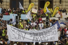 ![]() Związkowcy domagają się, aby gabinet premiera Nečasa wprowadził zmiany w pakiecie reform podatków, rent i emerytur oraz opieki zdrowotnej. Rząd konserwatystów, centroprawicy i populistów nie potrafił od blisko roku skonsultować ze związkami zawodowymi ich kształtu i sposobów wprowadzenia w życie. Dysponuje jednak w parlamencie tak dużą przewagą nad lewicową opozycją, że może przegłosować każdy projekt ustawy. Strajk, który rozpocznie się na początku nowego tygodnia pracy może sparaliżować kraj. Przestaną jeździć pociągi osobowe, w większych miastach autobusy i tramwaje, a w Pradze ruch metra zostanie ograniczony. Pracowników resortów komunikacji i transportu wspierać będą górnicy. Ich zadaniem w czasie strajku ma być blokada niektórych ważnych dróg prowadzących do co najmniej kilku największych czeskich miast - nie wiadomo jeszcze, których, gdyż związkowcy utrzymują to w tajemnicy. Foto: Niedawny proces przeciwko "reformom" rządu/www.ceskapozice.cz. |