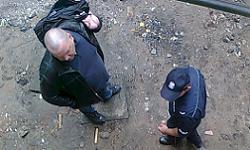 Na zdjęciu: Piotr Śruba w rozmowie z policjantem na dziedzińcu kamienicy przy ul. Stolarskiej. Fot. Rozbrat.org