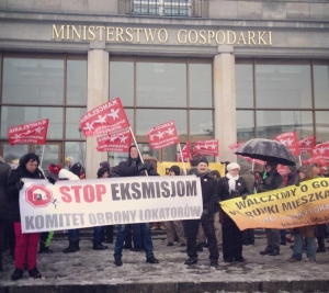 ![]() Protest zorganizowały Komitet Obrony Lokatorów, Kancelaria Sprawiedliwości Społecznej, Kolektyw Syrena, Kolektyw Przychodnia oraz Warszawskie Stowarzyszenie Lokatorów. Demonstracja rozpoczęła się przed Ministerstwem Gospodarki. Piotr Ciszewski z WSL i Lewicowej Alternatywy powiedział, że lokatorzy którzy są mniej zasobni są traktowani w Polsce jak ludzie drugiej kategorii i ża nie można mówić o demokracji w kraju, w którym ludzi sprzedaje się i kupuje razem z budynkami. Piotr Ikonowicz z KSS mówił o traktowaniu ludzi nie mających pieniędzy na płacenie czynszów jak przestępców, których należy wyrzucić z domów zamiast im pomóc. Andrzej Smosarski skrytykował z kolei system zmuszajacy ludzi do brania wieloletnich kredytów mieszkaniowych i wmawiający ludziom, że muszą mieć za wszelką cenę mieszkanie własnościowe zamiast czynszowego. Zebrani przeszli spod ministerstwa pod Sejm. Po drodze przypomniano historię eksmisji lokatorki z budynku przy Hożej 1 i fakt, że właściciel chce się pozbyć wszystkich jego lokatorów. Antoni Wiesztort z Kolektywu Syrena opowiedział o sytuacji budynku przy ul. Wiejskiej 11, który od lat stoi pusty, pomimo że w mieście tysiące ludzi czekają na mieszkania. Dodał, że jest to symbol braku racjonalnej polityki mieszkaniowej. Podczas przemarszu skandowano "Dość łamania praw człowieka", "lokatorzy to nie towar" oraz "chcemy mieszkań komunalnych". Demonstrujący dotarli pod sejm, gdzie pomimo pogarszającej się pogody odbył się krótki wiec. Przemawiała jeszcze Agata Nosal, która powiedziała, że Polska nie jest państwem prawa skoro ustawy zezwalające na eksmisje na bruk łamią konstytucję. Katarzyna Matuszewska z WSL udowadniała, że budownictwo czynszowe nie jest niczym nadzwyczajnym i dominuje w wielu prowadzących racjonalną politykę krajach. Przed Sejmem skandowano między innymi "Eksmitować polityków". (fot. J.E.) |