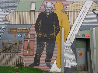 Na zdjęciu ściana w miejscu, gdzie stał dom Hrabala (ul. Na Hrázi 24, Praga); fot. Wikipedia Commons
