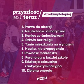 ![]() Konwencja dotyczyła przyszłości młodych ludzi i dlatego wypowiadali się na niej przede wszystkim członkowie młodzieżówek. Na jej zakończenie trzej liderzy Lewicy podsumowali wystąpienia następującymi postulatami: - prawo do aborcji; - neutralność klimatyczna; - koniec ze śmieciówkami; - szkoła bez religii; - tanie mieszkania na wynajem; - nauka, nie propaganda; - równość małżeńska; - psycholog w każdej szkole; - edukacja seksualna i antydyskryminacyjna - zielona energia. Polska zbyt długo była zdominowana przez starszych panów, sorry Włodku, ale tkwiących w polskiej polityce od 30 lat w parlamencie - przekonywał lider Lewicy razem Adrian Zandberg. Czas, żeby głos tego młodego pokolenia, które chce Polski sprawiedliwej społecznej, wolnej i nowoczesnej, wybrzmiał i zmienił nasz kraj. Zandberg przekonywał, iż neutralność klimatyczna jest najważniejszym wyzwaniem. Od tego zależy przyszłość naszej planety - mówił. Nawiązując do kwestii likwidacji tzw. śmieciówek Zandberg podkreślił, że Lewica chce zagwarantować wszystkim pracującym normalne prawa pracownicze: prawo do odpoczynku, urlopu, bezpieczeństwo socjalne i stabilność zatrudnienia. Lider Wiosny Robert Biedroń wyraził opinię, że ws. aborcji kobieta powinna decydować kobieta i powinno się to odbywać bez jakichkolwiek konsultacji. Broń Boże z politykiem czy biskupem - zaznaczył. Poruszył również temat równości małżeńskiej. Nie ma żadnego powodu, żeby dwie dorosłe osoby w XXI wieku nie mogły w urzędzie stanu cywilnego powiedzieć sobie to ważne "tak" - powiedział. W kwestii odejścia od węgla Biedroń zadeklarował, że Lewica chce wymiany 2 milionów pieców węglowych na piece zeroemisyjne. Postulat dotyczący tanich mieszkań znalazł się w wystąpieniu lidera SLD Włodzimierza Czarzastego. Jak powiedział, Lewica chce powołania państwowego przedsiębiorstwa, które wybuduje dwa miliony mieszkań. |