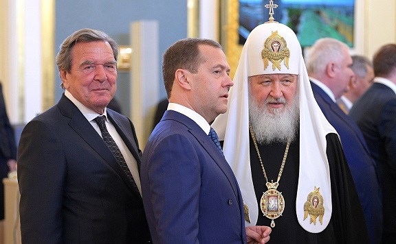 Schröder, Miedwiediew i patriarcha Cyryl na inauguracji Putina (2018); fot. Wikimedia Commons